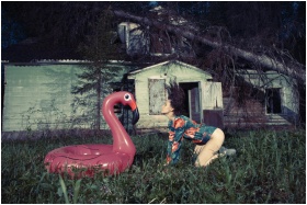 A woman poses beside an inflatable flamingo in front of an abandoned house at night. Eccentric and surreal.