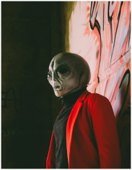 Alien figure wearing a red jacket stands against graffiti in an urban setting.