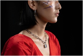 Artistic side profile portrait of a woman with face paint and bold jewelry on a black background.