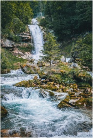 Majestic waterfall cascading through lush green fo