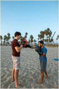 Two men engaged in a boxing workout on a sandy beach with palm trees around.
