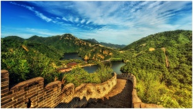 Breathtaking landscape of the Great Wall of China surrounded by lush green hills and vibrant skies.
