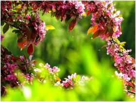 Bright pink flowers blooming in a lush spring garden with vibrant green foliage.