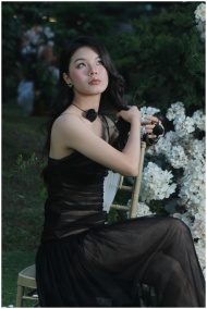 A woman in a black dress poses elegantly on a chair surrounded by white flowers in a garden.