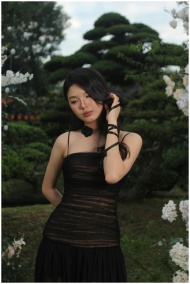 A woman in a black dress poses gracefully in a lush garden with ornamental trees.