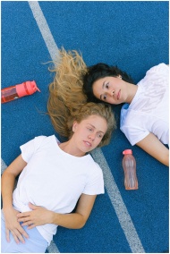 Two women in activewear resting on a track with water bottles, promoting fitness and relaxation.