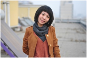 Portrait of a smiling woman wearing a brown coat and scarf, standing outdoors with city backdrop.