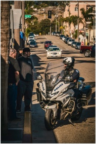 Police officer on motorcycle interacting with people on a sunny urban street.