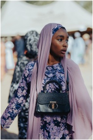 Young woman in purple traditional attire, with a black handbag at cultural event outdoors.