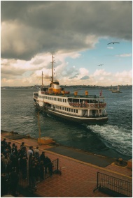 A ferry sails away from the marina under a dramatic cloudy sky, capturing a lively waterfront scene.