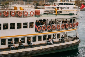 A bustling ferry carries passengers across the Bosphorus in Istanbul, Turkey.