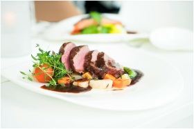 Elegant presentation of sliced beef with herbs and sauce, capturing fine dining ambiance.