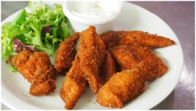 Delicious crispy fried chicken tenders served with a fresh green salad and dipping sauce.
