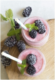 Enjoy a refreshing blackberry smoothie topped with fresh mint leaves, perfect for a summer treat.
