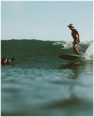 A man surfboarding on ocean waves under a clear sky, showcasing summer vibes.