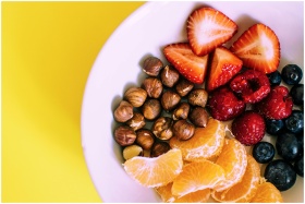 Close-up of a bowl with fresh fruits and nuts against a vibrant yellow backdrop.