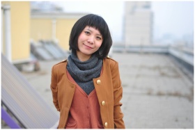 Casual outdoor portrait of a smiling woman on a city rooftop.