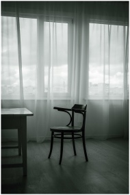 A stylish minimalist room featuring a wooden chair by a window with sheer curtains, perfect for interior design concepts.
