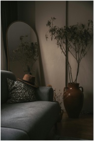 A cozy living room with rustic elements, featuring a gray sofa, hat, and large vase.