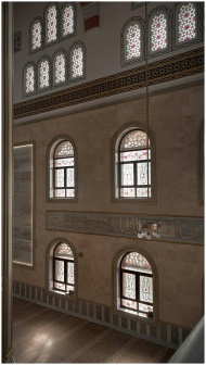 Beautiful mosque interior featuring intricate stained glass windows and Arabic calligraphy.