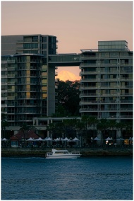 Modern high-rise buildings flanking a moonlit sky, with a boat on the waterfront at sunset.