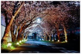 A scenic street lined with cherry blossom trees illuminated under street lights at night, creating a serene ambiance.