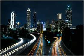 A vibrant cityscape at night showcasing light trai