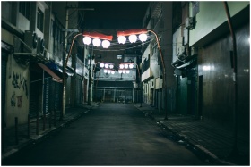 A deserted urban alley at night featuring unique red-lit hanging lights, creating a dramatic atmosphere.