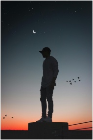 A solitary man stands silhouetted against a serene dusk sky, with a crescent moon and birds overhead.