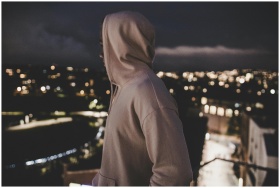 A person in a hoodie overlooks a blurry cityscape at night, evoking mystery and solitude.