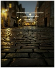 Illuminated cobblestone street during evening with festive lights and wet reflections.