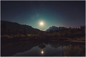 A peaceful view of moonlit mountains reflected in a tranquil lake under a starry sky.