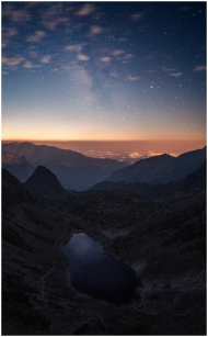 Breathtaking view of Slovakia's High Tatras at night with starry sky and tarn.