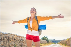 Happy woman basking in sunlight on a summer hike with yoga mat.