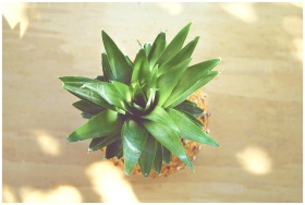 Aerial shot of pineapple top showing vibrant green leaves on a light background.