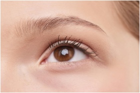 Detailed close-up of a woman's natural brown eye, showcasing eyelashes and eyebrow.