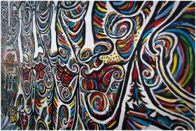 Colorful abstract mural art depicting swirling patterns on the Berlin Wall.