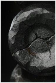 Detailed view of a cracked, textured black stone surface highlighting its natural pattern.