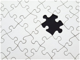 Close-up of an incomplete white puzzle with one missing piece, symbolizing challenge and strategy.