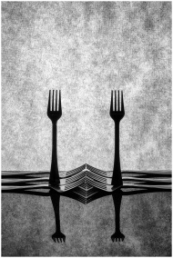 Artistic black and white photo of forks reflecting symmetrically, creating an abstract design.