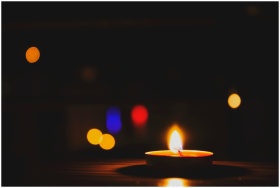 A candle glows warmly in the foreground against a bokeh-filled dark background.