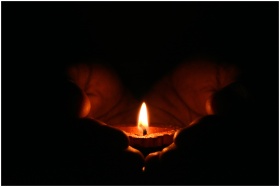 Close-up of hands warmly embracing a lit candle in the dark, creating a cozy atmosphere.
