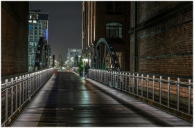 Modern urban bridge lit at night with buildings and a person walking, creating a serene city ambiance.