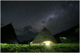 A serene nighttime scene with a brightly lit traditional hut under a starry sky.