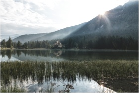 Peaceful lake view with house, mountains, and forest at sunrise. Tranquil and serene atmosphere.