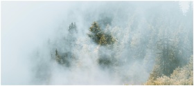 Serene misty forest with fog enveloping tall conif