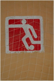 Close-up of a painted soccer symbol on a wall, covered by netting.