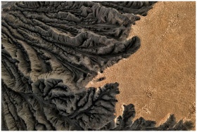 Drone capture of a barren, eroded geological formation in a desert, showcasing dramatic textures.