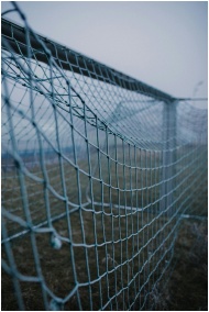 Detailed close-up of an empty football goal net under overcast, gloomy sky, capturing the essence of anticipation in a football field.