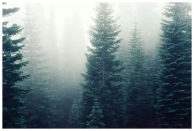 A tranquil and mysterious pine forest shrouded in dense mist, creating a serene and eerie atmosphere.